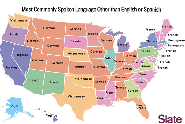This map of most commonly spoken language in American states other than English or Spanish is by Ben Blatt of Slate.com. He used data from the Census Bureau’s American Community Survey.
