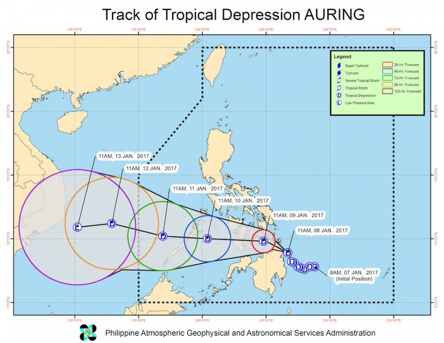 As of 2:00 p.m., ‘Auring’ is located at 80 km North Northeast of Hinatuan, Surigao del Sur.