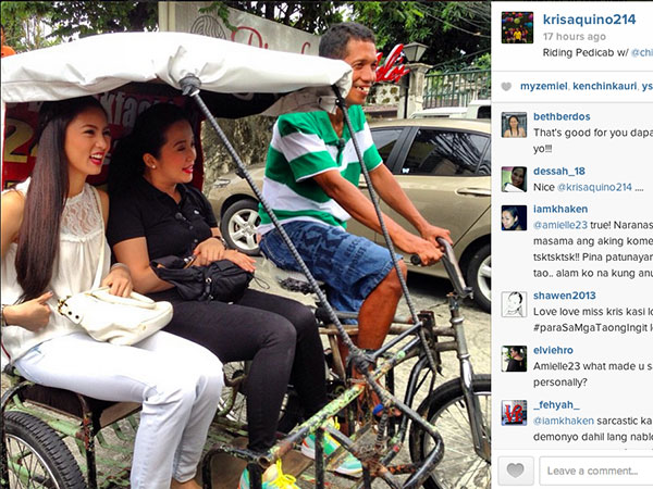 Ah, what is it with showbiz and formula: if it worked the first time, it will mostly work a second time, right? After getting news coverage and tons of social media mileage for posting a selfie while on the MRT (including a positive editorial from Coconuts Manila), the famously polarizing presidential sister rode the train again yesterday morning (and a jeepeny, and a pedicab) this time with co-host Kim Chiu and a film crew on hand. Kris Aquino gamely went through the motions of inspections, queues and even talked talked to a random passenger, whom she appeared to try to convince about the “convenience” of taking public transport. She even noticed “how clean” the trains were. During the trip, Kris spoke with the head of the Light Rail Transit Authority, who runs the train operations, and they discussed the annual government subsidy and the planned extension project. Last week, heavy monsoon rains stalled traffic in Metro Manila and Kris hopped onto a train so she wouldn’t be late to an event. MM