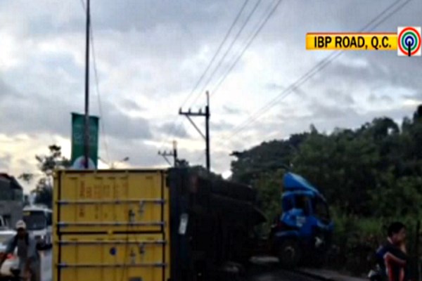 “On Wednesday morning, July 30, a man was seriously injured after a 40-foot trailer truck rammed a concrete post and then turned on its side along San Mateo-IBP Road in Quezon City,” reports ABS-CBN News correspondent Kori Quintos on ABS-CBNnews.com.