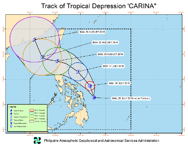 “Carina” is expected to be 85 km east of Virac, Catanduanes by tomorrow evening, Sat, Jul 30.