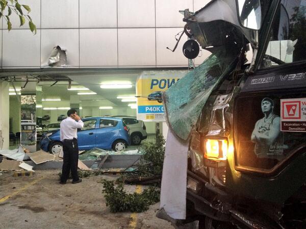 “On Wednesday, May 7, at least five people were hurt after a wayward dump truck rammed a passenger jeepney before crashing into a car showroom at the corner of Quezon Avenue and West Avenue in Quezon City,” reports dzMM correspondent Johnson Manabat on ABS-CBNnews.com.