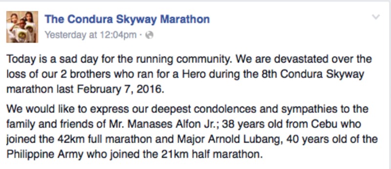 The Condura Skyway Marathon Facebook page confirmed the deaths, and they posted messages of sympathy for the families of the deceased.
