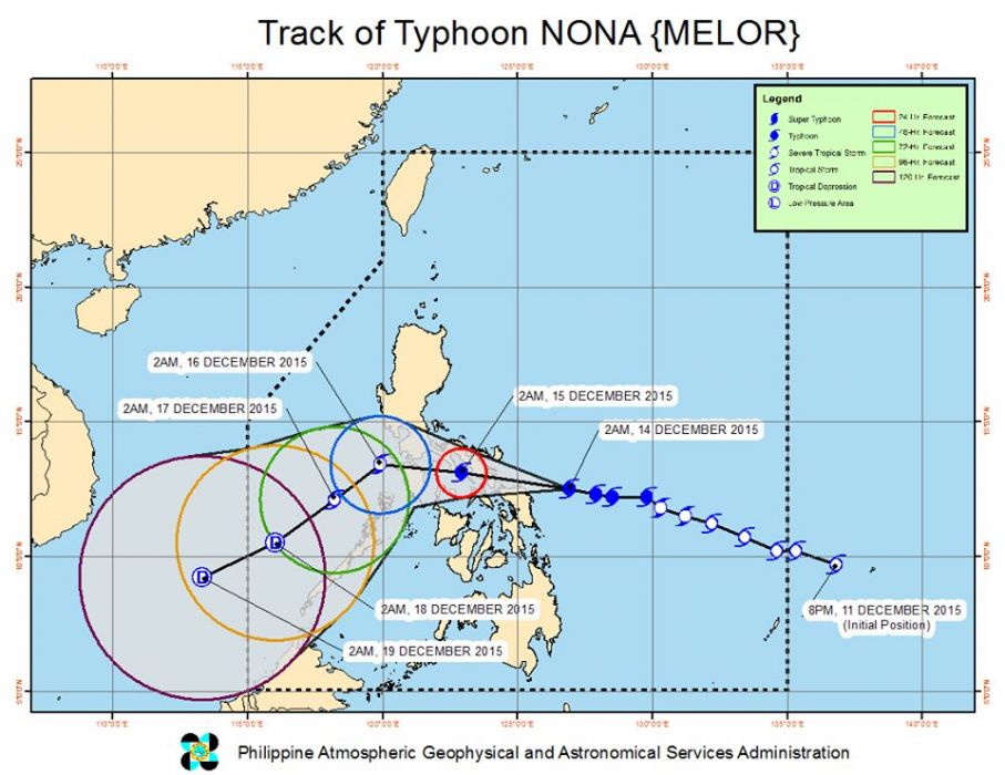 At 4am on Dec 14, the Philippine Atmospheric, Geophysical and Astronomical Services Administration (PAGASA) reported that the eye of Typhoon Nona (international name: Melor) had been located 205 kilometers (km) east of Catarman, Northern Samar with maximum sustained winds of 150 kph near the center and gustiness of up to 185 kilometers per hour (kph).