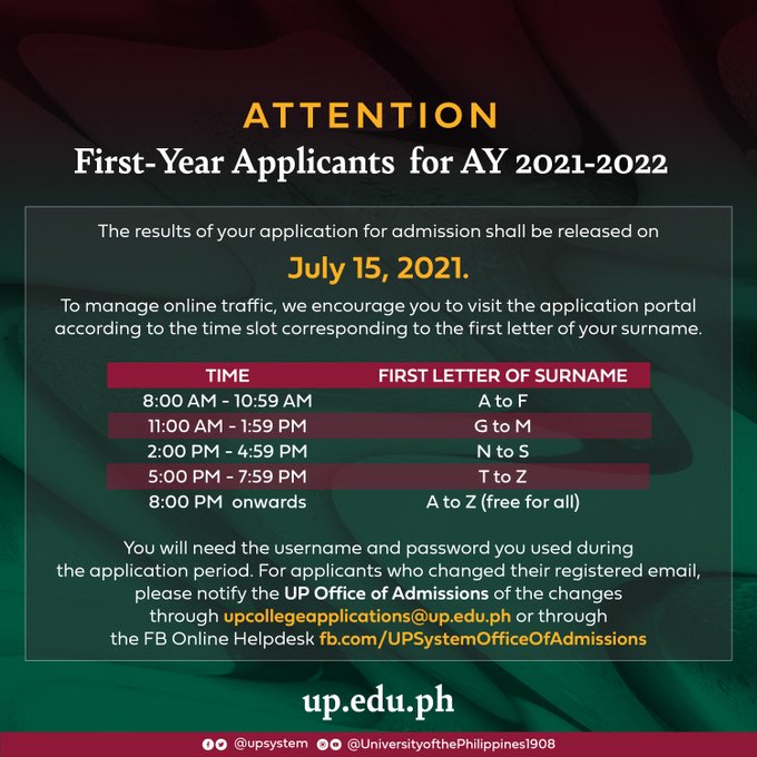 Hopeful freshmen-to-be need to log on to the UPCA portal with their registered email addresses. Those who need assistance, including people who have changed their email addresses in the interim, may contact the UP Office of Admissions at upcollegeapplications.oadms@up.edu.ph.