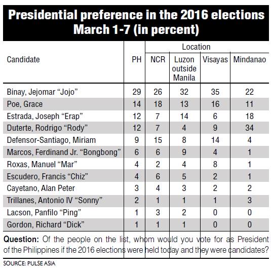 Voter preference for Binay, who is being investigated in the Senate for the alleged irregularities in Makati when he was its mayor, increased from 26 percent in November last year to 29 percent in March.