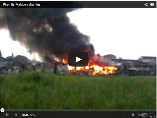 At least 100 families were displaced by a three-hour fire that gobbled a shanty community in Malabon on Monday morning, according to the local fire department. Some 50 houses were set ablaze in Barangay Tinejeros, purportedly after a tank of liquefied petroleum gas exploded, reports Jamie Elona in Philippine Daily Inquirer. The fire spread quickly in the community because the houses were made of easily combustible material. The fire, which reached the fifth alarm, was put out by fire fighters at 12:42pm. Check out Inquirer‘s video below.