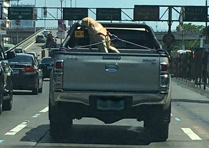 A Facebook post that shows a poor Labrador leashed on the back of a Ford pick up truck travelling along EDSA-Ortigas in the middle of the day has gone viral.