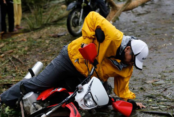 OMG! does he know how? no helmet! “@rapplerdotcom: Mar Roxas falls from motorcycle in Taft, Samar island. #RubyPH pic.twitter.com/V57m6HhOdR”