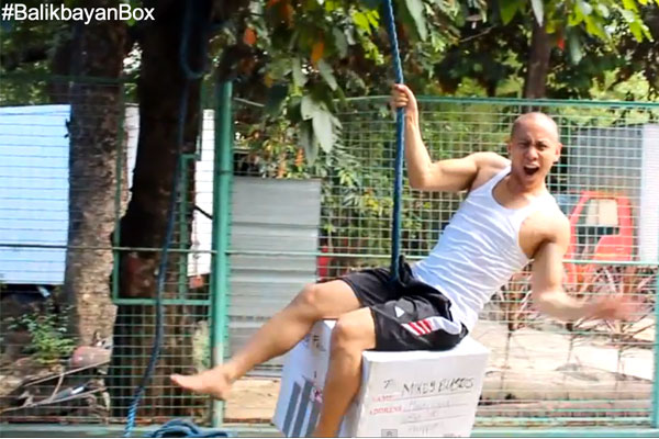 Bustos — garbed in a Pinoy’s favorite combo of white sando, basketball shorts and pambahay — gamely swings on top of a hanging balikbayan box from a inimitably Filipino backyard. Ah, we should stop talking about it and let you see it for yourself: