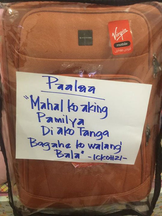 We’re hoping this cute little poem an OFW based in Saudi Arabia taped on his bag will talk some sense and embarrassment to those bastards preying on innocent travelers.