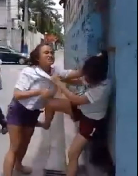 They get into a fight that’s seen more contact than the supposed fight of the century. They kick each other, they pull each other’s hair in daylight, right out on the street and to the delight of classmates who were heckling the two girls to kick pa more.