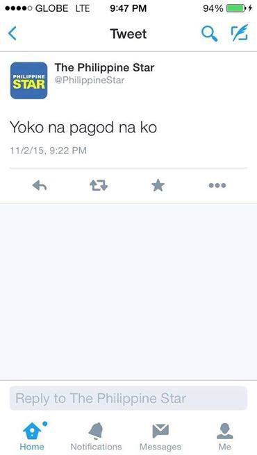 On Monday evening at 9:22pm, Philippine Star shared this sentiment with its 288,000 followers — “Yoko na pagod na ako.”
