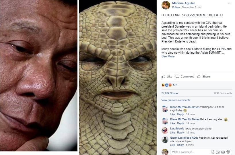 According to Marlene Aguilar, the sister of folk singer Freddie Aguilar, Philippine President Rodrigo Duterte is dead. And that guy in Malacañang Palace? “A reptoid alien,” Marlene wrote on her Dec. 3 post.