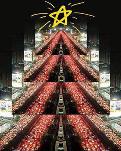 With the right amount of humor and the most basic photo editing skill, Jhett Baroma turned the traumatic Tuesday evening carmaggedon photo to look like…a Christmas tree.
