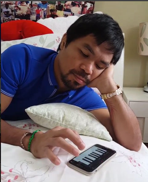 On the video, you’ll see the eight-division world champion and member of the Philippine senate snicker, smile, and roll over after playing with his phone.