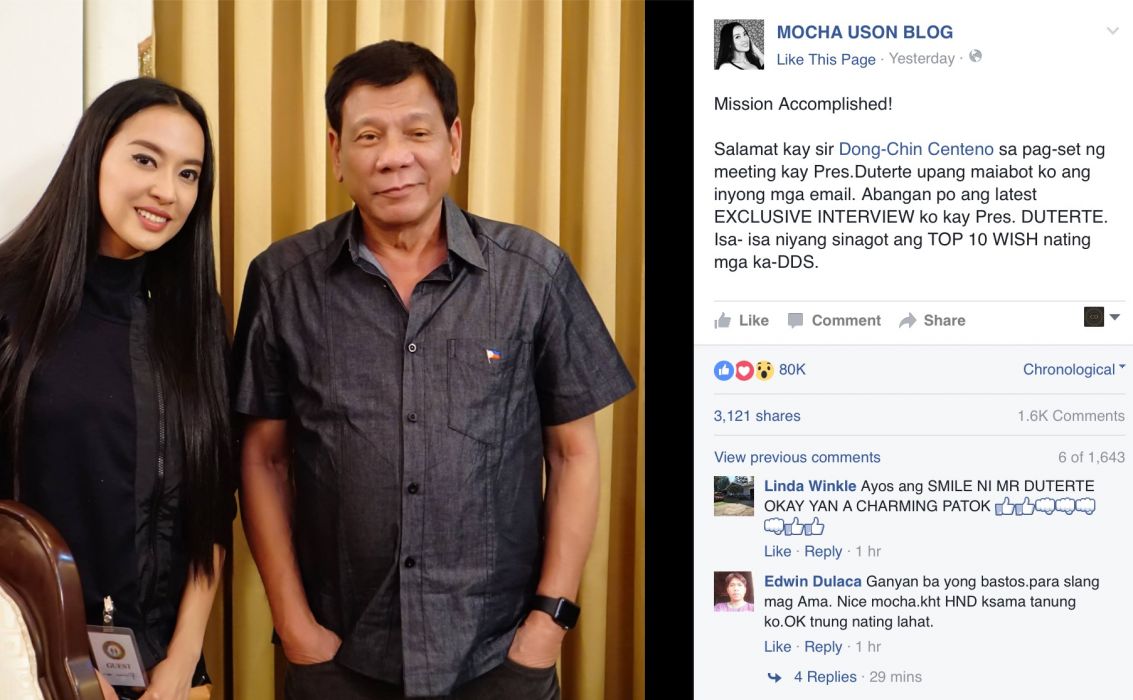 On Facebook she explained that the connections she made during Duterte’s campaign helped her set a meeting with the president on Jun 24 in Davao City despite his decision to refuse interviews and boycott the media.