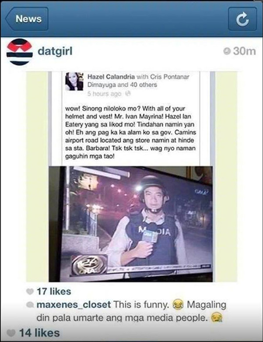 There’s an Instagram photo posted by user Hazel Calandria that’s going around on Facebook and Twitter. It shows a screen grab of broadcast journalist Ivan Mayrina, live in Zamboanga, introducing a report he filed for GMA News after spending a day covering events in Barangay Santa Barbara. Calandria’s comments: “Sinong niloko mo? With all of your helmet and vest? Hazel Ian Eatery yang sa likod mo! Tindahan namin yan oh!”