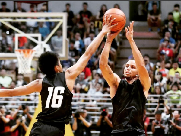 During a game at the Under Armour Asia Tour in Taipei, Taiwan, on Tue, Sep 6, Batang Gilas member Gian Mamuyac blocked a shot from for NBA superstar Stephen Curry.