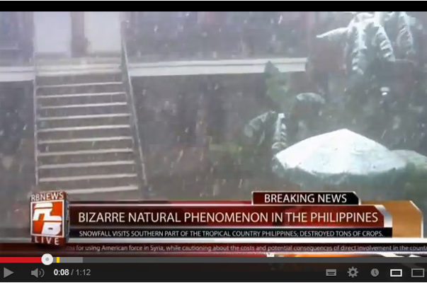 This video, supposedly of a Rodsburgh News Live news report of snow in the “Southern Philippines”, has been spreading on social media since this morning.