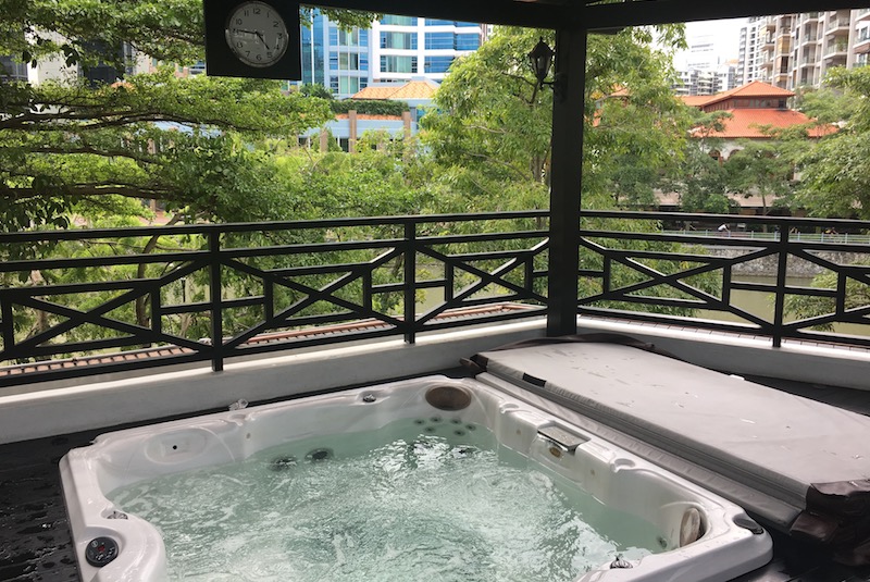 It’s the condo for exhibitionists, it seems. A glorious Jacuzzi by the barbeque pits overlooks the footpath along Singapore River.
