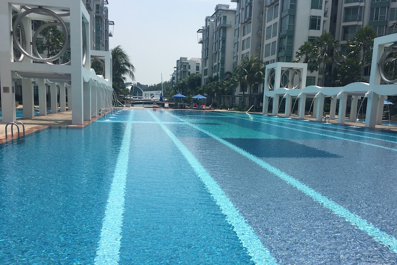 Which is just as well. The freeloader can cruise by in the enormous, empty lap pool and wonder how long it would take to save up to pay the S$2 million asking price for one of these fabulous fun palaces, which have their own private mini-pools that connect to the main one.
