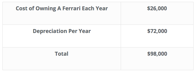 The depreciation cost of a Ferrari is estimated at about $72,000 per year. In total, a Ferrari would easily lose you about $98,000 per year, assuming you bought it without requiring a loan, which would add more interest cost to your purchase.