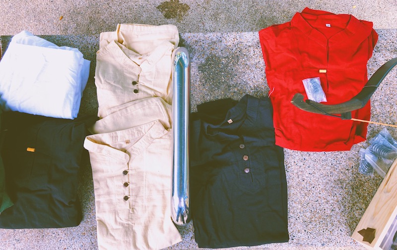 Presumably disappointed by the utter lack of inspiration for the moniker, she pointed me to a bench behind her, where a bunch of tunics in different colors were laid. This was the basic layer of costume everyone had to wear, which came along with a belt to hold everything together.