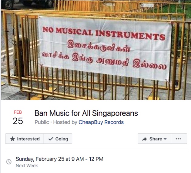 Perhaps as a jibe on Singapore’s widespread disapproval on all things cultural, a similar Facebook event page was set up to call for the total banning of music for all Singaporeans.
