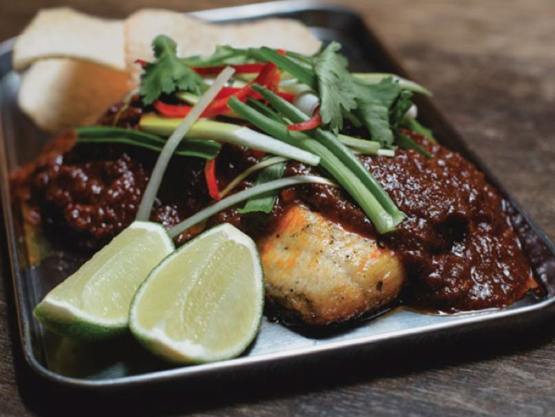 What it is: No. 38: Pan-seared barramundi with sambal belachan, lime and prawn crackers, $22