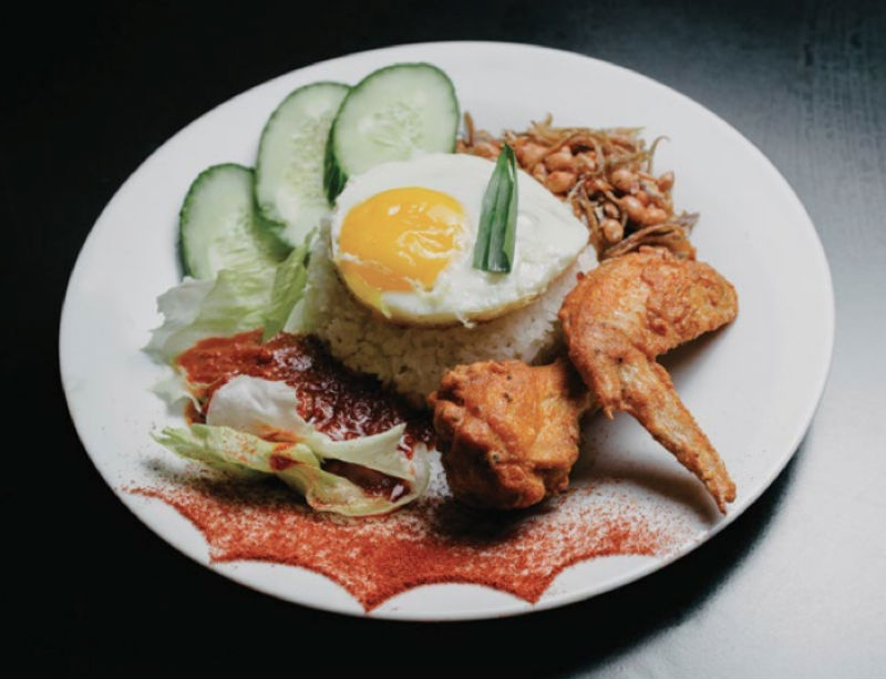 What it is: Aromatic coconut rice with spiced chicken wings, crispy anchovies and peanuts, plus anchovy sambal, $7.80 with coffee