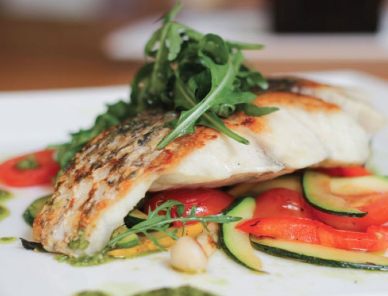 Grilled Barramundi with Basil Almond Pesto at Food for Thought