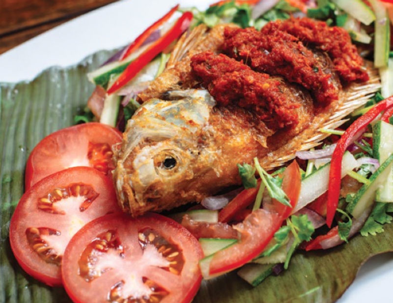 What it is: Deep fried tilapia with sambal sauce and mixed raw veggies, $10