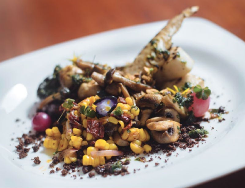 What it is: Mixture of mushrooms, local bamboo shoot and spicy corn on a bed of edible soil, drizzled with pistachio pesto sauce, garnished with tomato flower, clown flower and wood sorrel, $14