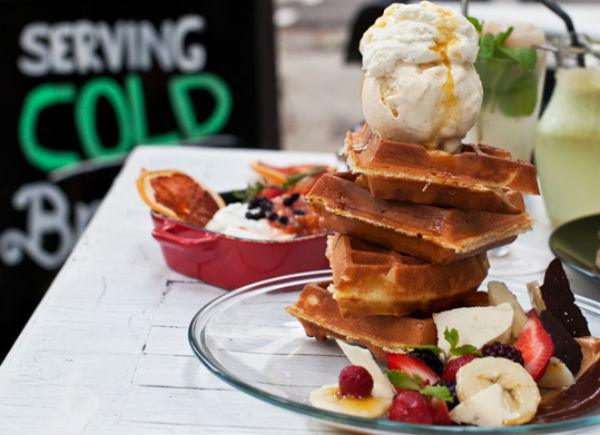 Complete your hipster cafe outing with an order of warm fluffy waffles with vanilla ice cream. It’s served with enough accompaniments to make each bite taste distinctly different. There’s mixed berries compote, sticky syrup, peanut butter, chocolate hazelnut spread and whipped cream. It’s only available during the daytime (lunch and brunch), so there’s time to work off those calories in gym later in the day.