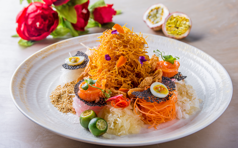 Capella Singapore’s fine dining Cantonese restaurant offers two options for your festive gatherings. The ‘Prosperity Lou Hei’ – good for a table of two to four people – features ingredients like fresh greens, salmon and passionfruit sauce. But if you’re bringing the entire gang there, indulge in the signature plate served with lobster and sea urchin, and throw in abalone while you’re at it.
