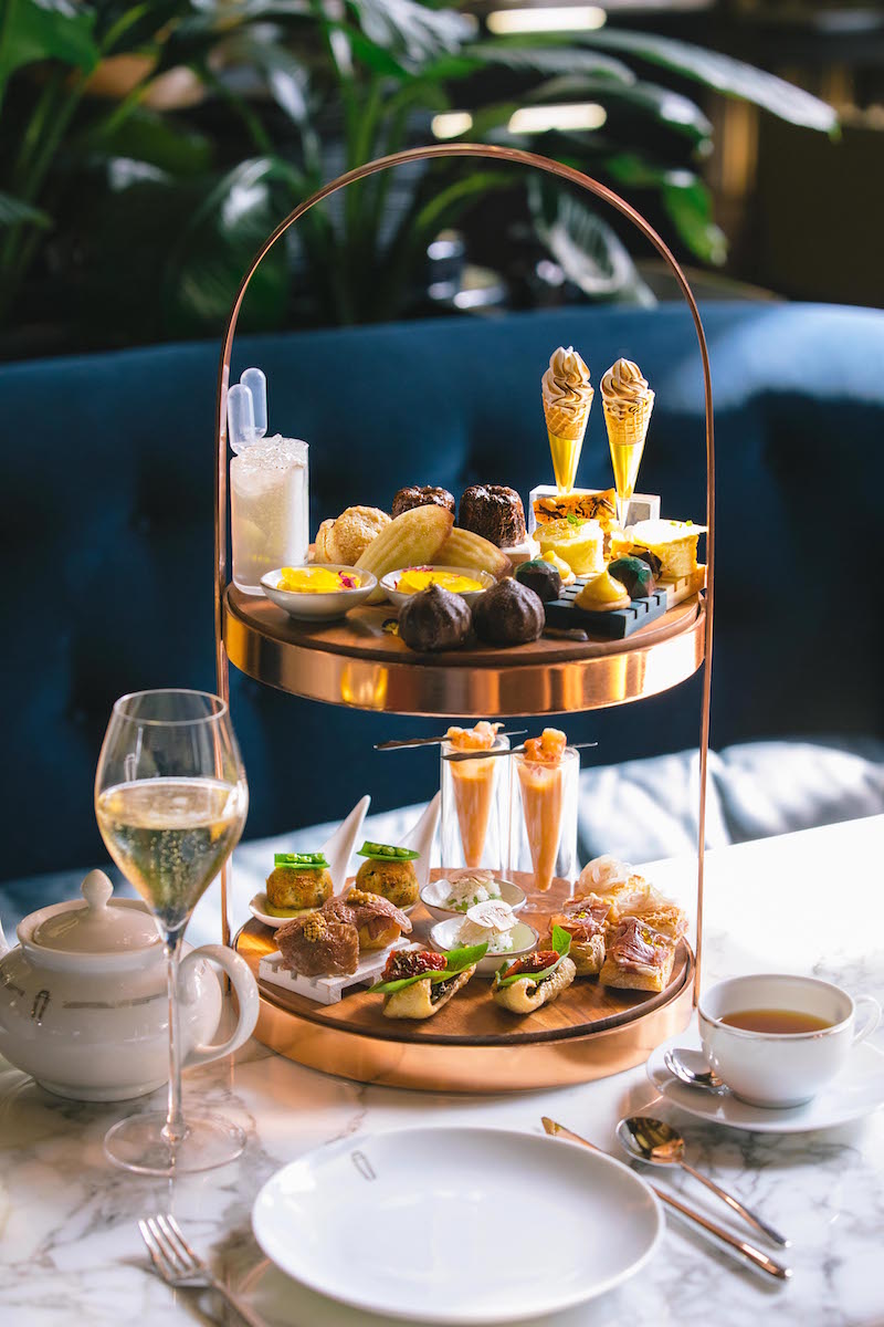 On the newly-refreshed menu, guests are served bite-sized treats on a gorgeous two-tiered rose gold stand (you will be tempted to bring the entire thing home with you, just sayin’). Start with savories like croque monsieur, wagyu eclair, Iberico jamon on toast, crab croquette, basil panna cotta, and a margherita pizza-inspired pasta cracker topped with mascarpone, tomatoes, basil, and oregano.