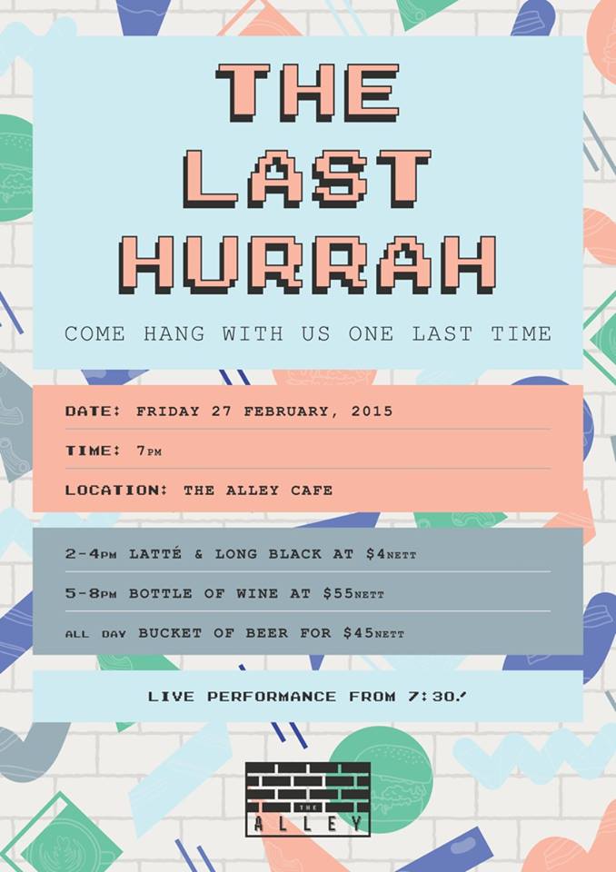 Wave a final goodbye to The Alley tonight in The Last Hurrah tonight at 7pm, where they’ll be having live performances and beverage promos as a farewell toast. Yet another one bites the dust.