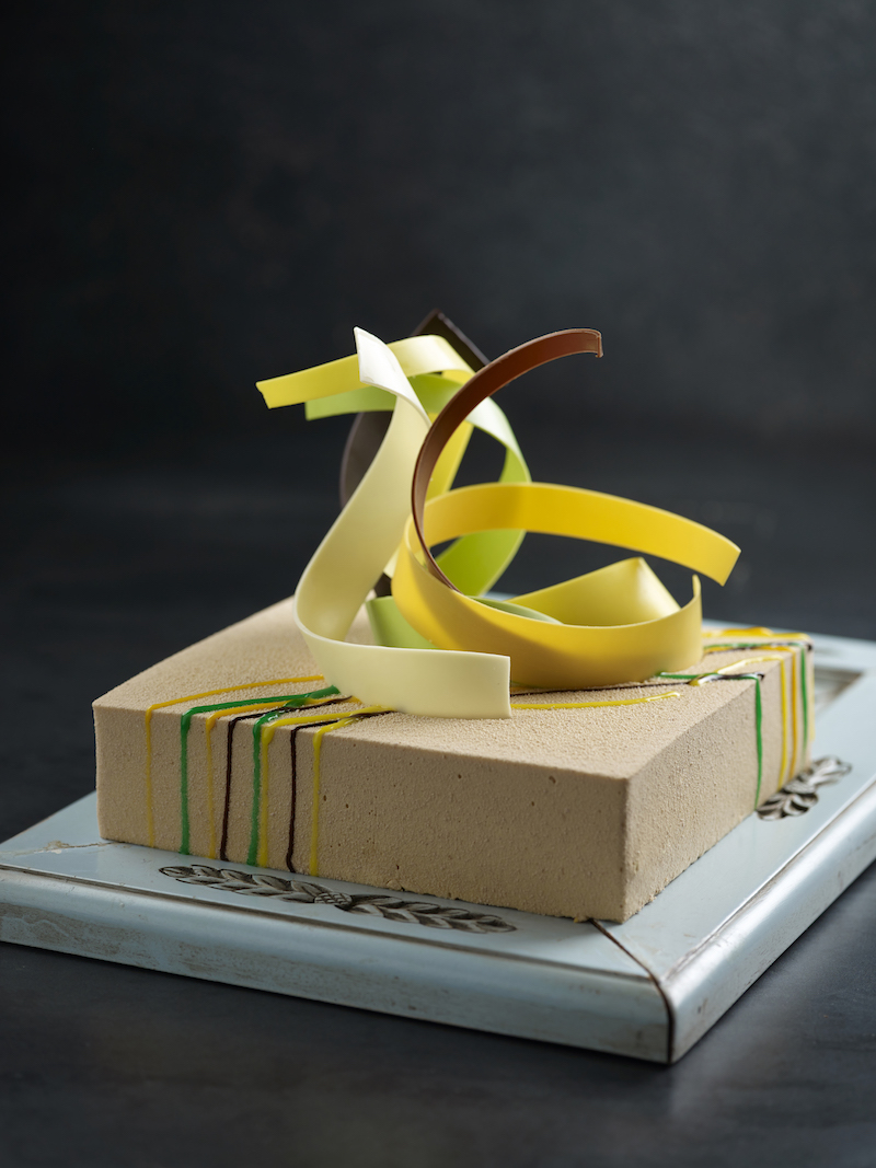 As for Cheese Please — it’s a tribute to Issey Miyake’s Pleats Please edit, recreating the aesthetic with funky geometric lines on a cheesecake that’s both sweet and savory. The mousse is a blend of cheddar cheese, cream cheese, and parmesan, layered with almond shortbread, and topped with apricot jelly.