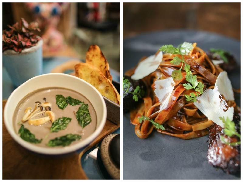 Photo: From left: Mushroom soup and beef cheek pastaCoffee snobs might baulk at the idea of “ice blended fruit coffee”, but this concept seems to sit well with the rest of the cafe-hopping folk. You’re served a thick fruit smoothie in one of their large Absolut Vodka cups on a block along with two shots of espresso, which you can measure out and pour according to your liking. They have three flavours — avocado, blueberry and orange mint — each priced at $8.
