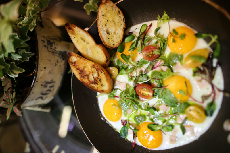 Photo: A plate of sunny side ups with rocket to shareRight now there are three salad options starting at $14.90 and only one soup — the Silky Smooth Mushroom Roomies ($8.90). If you’re in a small group (of say, two or three people), order the Hot Chick from Head to Toe (a whole roast stuffed chicken served with salad, two sides and two condiments at an affordable $22.90) to share. The ricotta lemon cream ravioli in tomato stew ($17.90) is also delicious, but best kept to yourself. Other mains include the pan-seared sea bass in balsamic dressing ($21.90), roast pumpkin with quinoa ($14.90) and Moo-licious Cheeks ($24.90), a tangy beef cheek tagliatelle. If you’re the breakfast sort, AEIOU also serves sunny side eggs ($8.90 for two people, includes rocket and pesto) with the option to add duck confit, smoked salmon, turkey ham. Two sides we liked were the root vegetable fries (potato, sweet potato, yam with chilli and sour cream for $7.90) and the beautifully plated rice wraps, which contained prawn, crunchy greens and edible flowers ($8.90).
