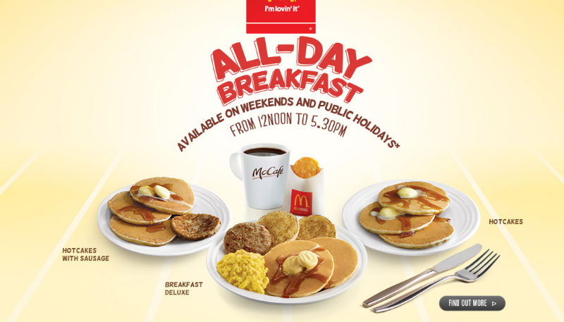 Not all day everyday, but this is quite enough: as a trial, McDonald’s Singapore is offering their signature Hotcakes, Egg McMuffins and all the other good stuff from noon to 5:30pm on weekends and Public Holidays at 33 outlets islandwide.