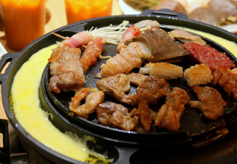 How does it work? First, cook the slices of food on the grill, just like you would at any other mookata place. When they’re almost ready, pour the grated mozzarella and cheddar cheese into the side troughs, wait till they melt, and dip away. Just don’t leave the cheese on the grill for too long, or you’ll end up with burnt pieces.