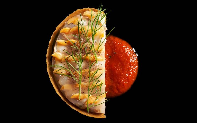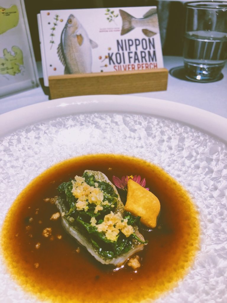 From Nippon Koi Farm in Sungei Tengah comes a basted slice of silver perch swimming in a Singapore version of dashi, topped with Ulam rajah flower by local urban farming social enterprise Edible Garden City. Nasi lemak is condensed into a single bite-sized form as a dainty cheong fun skin (infused with coconut milk, pandan leaves, and garlic) wrapped around sambal and a sous vide egg, topped with deep-fried chicken skin, ikan bilis and cucumber.