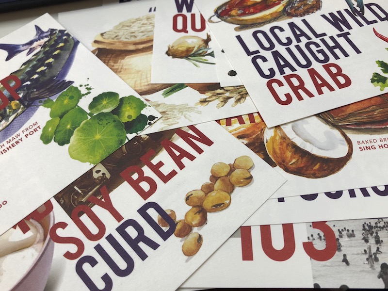 A wall of the restaurant is a shrine to ingredients and local produce that most of us would be able to identify immediately — classic building blocks of Singaporean cuisine. Another wall pays homage to Chef Han’s grandmother by way of suspended old-school kitchenware used during weekly family dinners at home. Tunes from local musicians such as Charlie Lim and The Observatory pipe down from the ceiling. A small map is positioned on each table, showcasing exactly where the ingredients are obtained from the various local growers and farmers. Printed postcards featuring gorgeous illustrations by a local artist explains the motivations and stories behind each entrée.