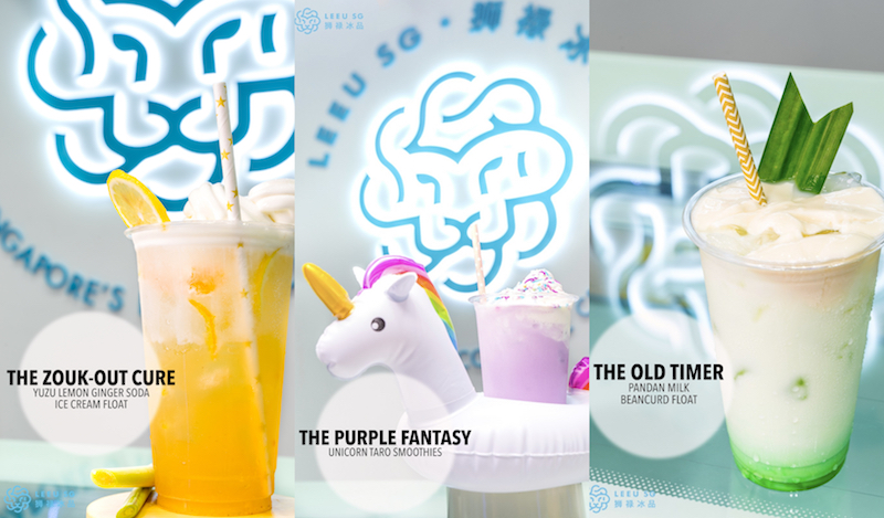 They’re also doing varieties of milk or soda-based ice cream floats — intriguing-sounding concoctions like The Zouk-Out Cure ($6.80) with yuzu lemon ginger soda; The Purple Fantasy ($7.80), a taro smoothie served in a unicorn float; The Old Timer ($6.80) made with pandan milk and beancurd; or the Sentosa Breeze ($6.80), lychee soda in a cool shade of blue.