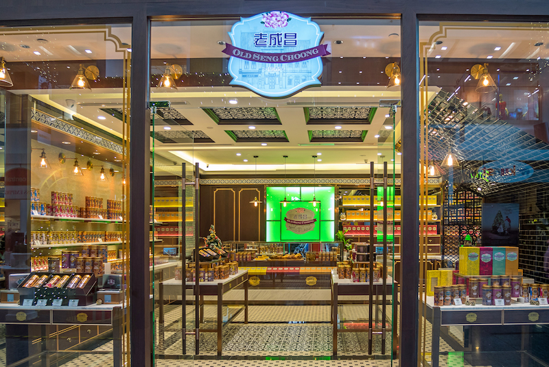 Even though they sit just a couple units away from one another, both stores are worlds apart in appearance and product. At Old Seng Choong, you’re welcomed into a warm, elegant, and slightly sentimental space featuring mosaic, marble, wood, brass, and Chinese lattice work. Start at the kacang puteh station to snack on roasted or fried nuts and legumes while you make your way through the shop and its array of baked goods.