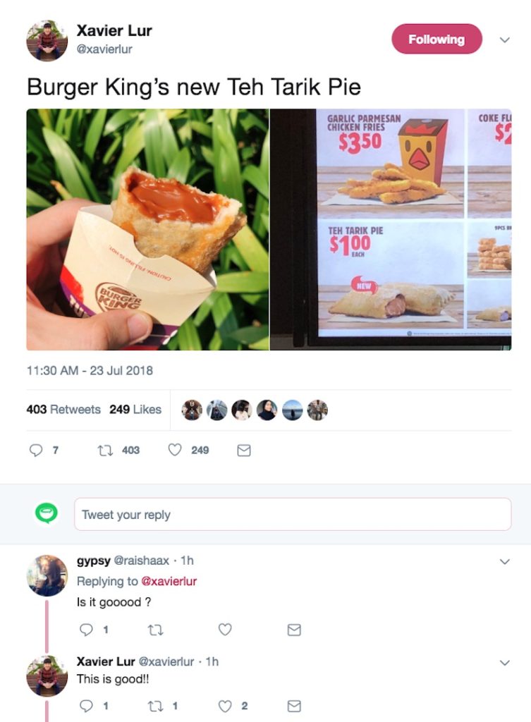 Burger King hasn’t, though. The often disregarded fast-food joint has been trying hard to win back customers with their own local-inspired burgers after their Ultimate Striploin Steak Mushroom Swiss™ got thoroughly slammed. With their Hainanese Tendergrill Chicken burgers and Rendang burgers launched last week to lukewarm reception, perhaps the new Teh Tarik Pie will get Burger King some love.
