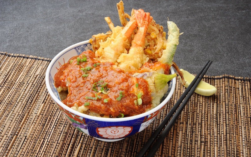 Each tendon dish comes topped with asparagus, pumpkin, fish fillet, eggplant, veggie and seafood kakiage, and prawns — these tempura items are fried at a particular temperature in a water fryer to emerge light and crispy.