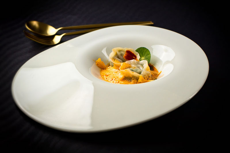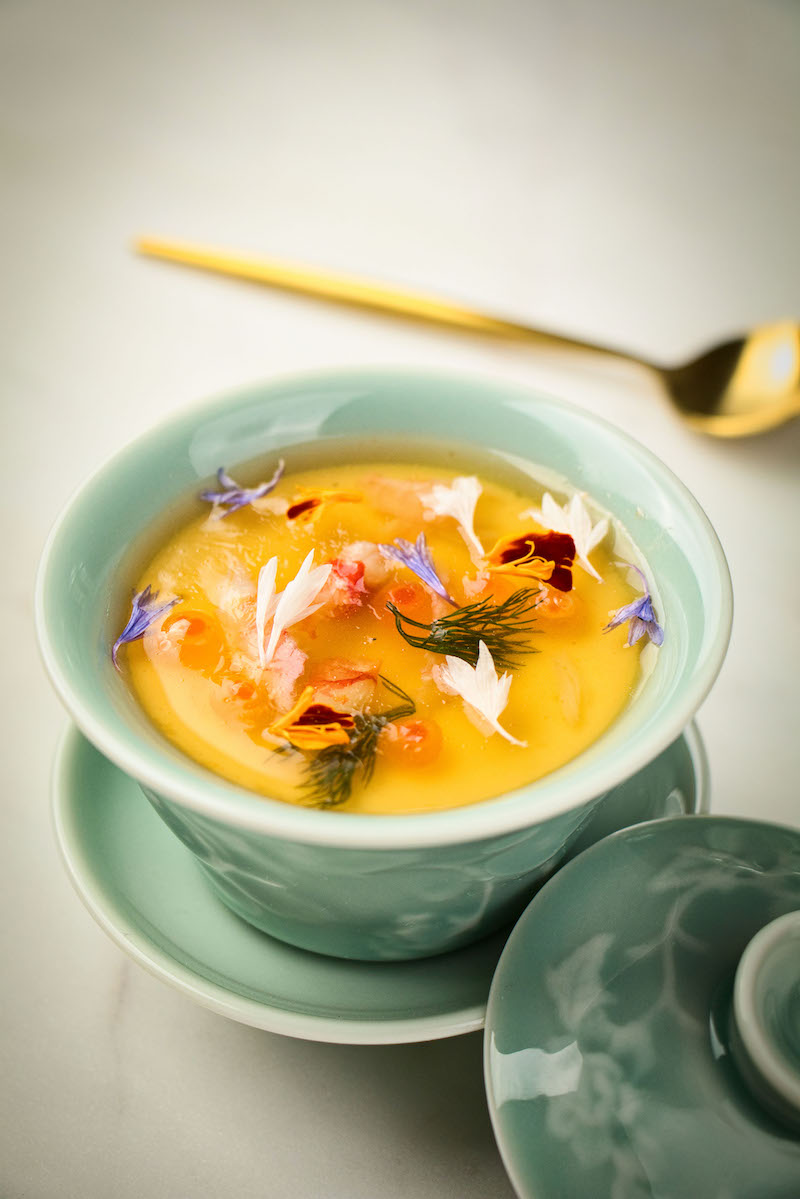 For a start, get your taste buds going with Egg Royale, a cold amuse-bouche of silky smooth Cantonese steamed egg custard (reminiscent of chawanmushi) with a top layer of gel created from prawn head stock, salmon roe, and crabmeat.